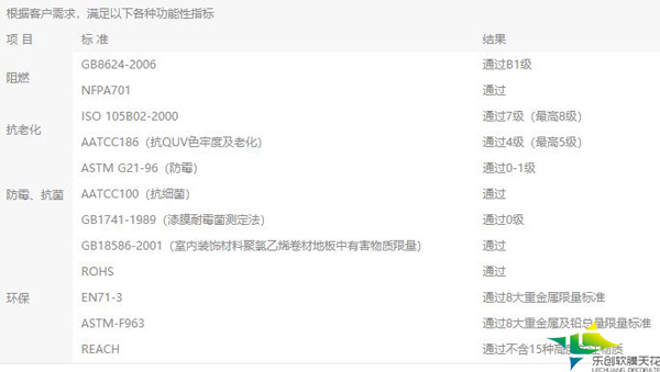 3、防水防潮性:在一般潮濕的環(huán)境下防水防潮表面不結(jié)水露。 除了上述優(yōu)點(diǎn)以外軟膜天花還有很多性能,性能優(yōu)點(diǎn)參數(shù)如下圖: